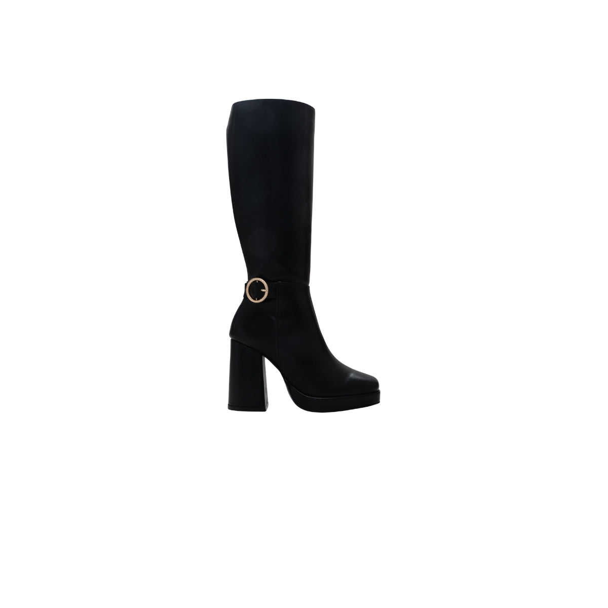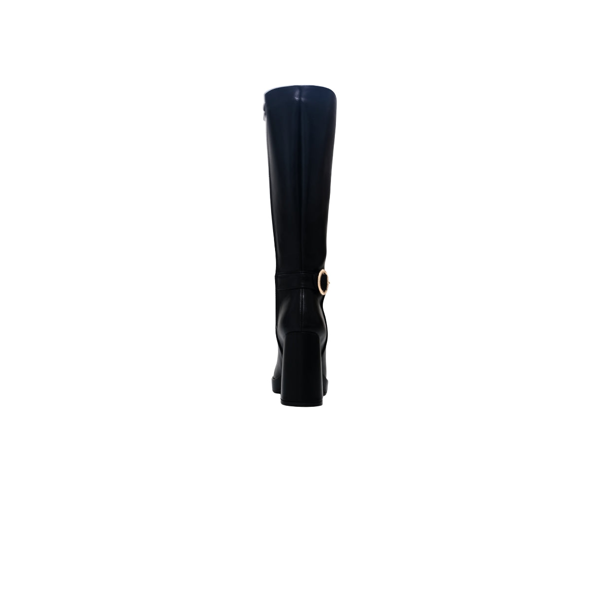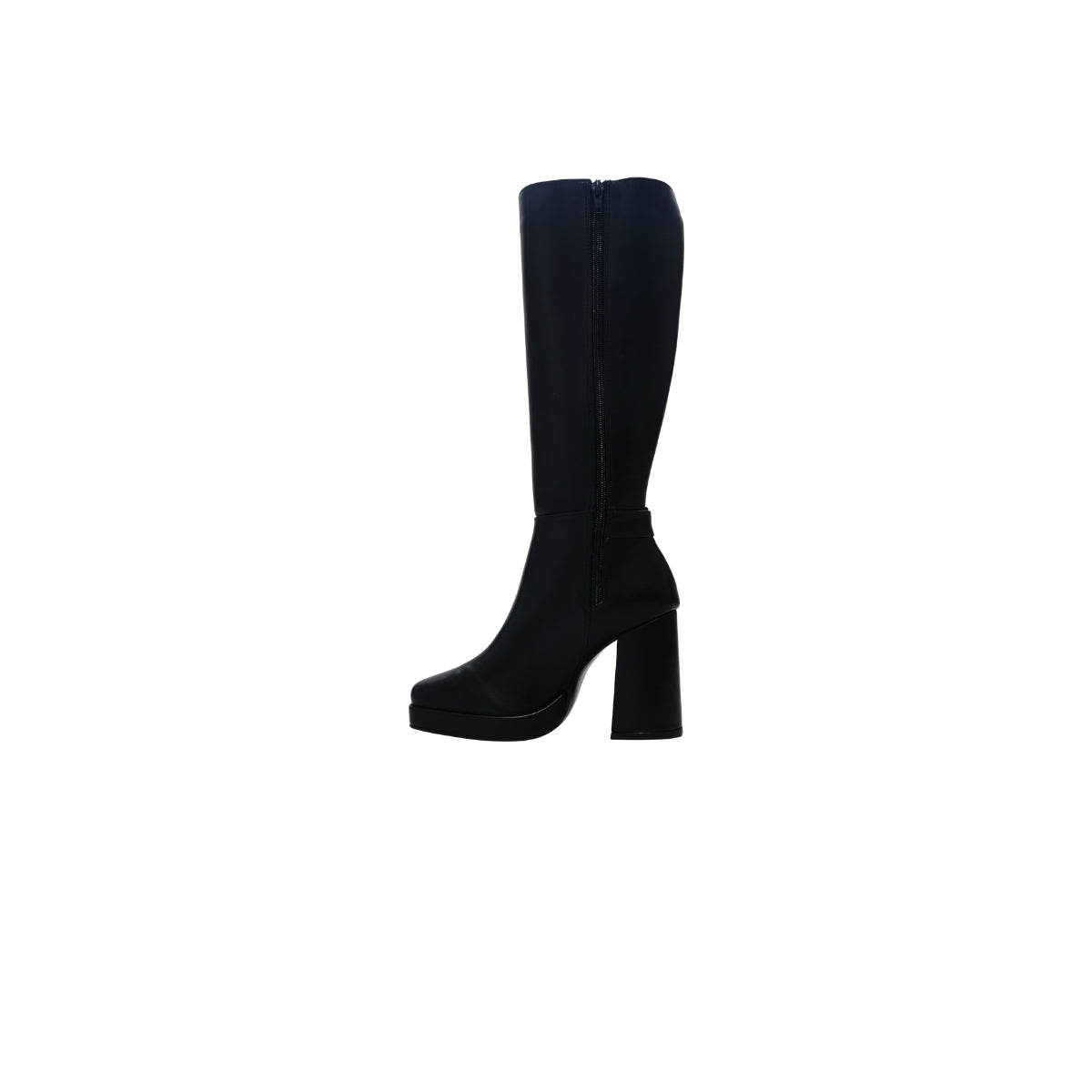 Bota larga para dama elaborada en piel vegana color negro, con diseño que llega justo debajo de la rodilla. Su tacón de bloque de 9.5 cm y plataforma de 1.5 cm brinda estabilidad y un look elegante. Incorpora cierre lateral para fácil calce y una estructura cómoda para uso diario. Ideal para combinar con atuendos casuales o formales en cualquier temporada.