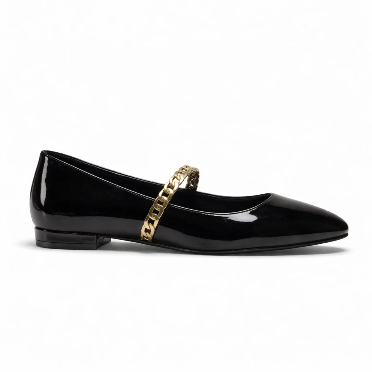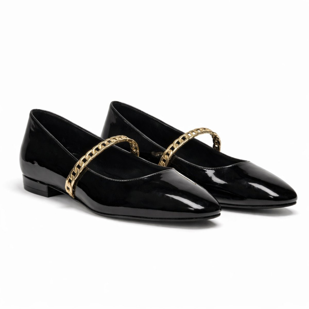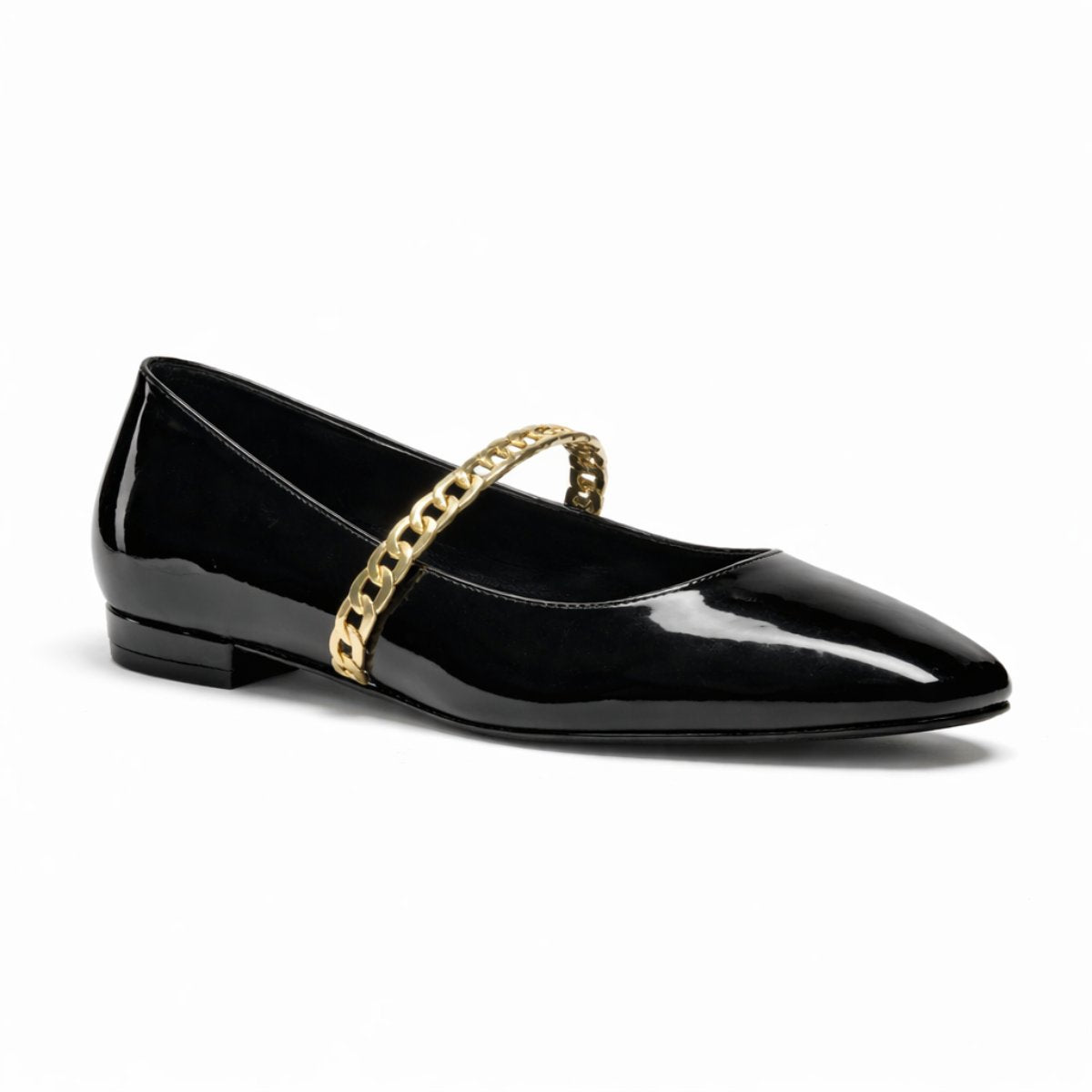 Flat en negro charol con diseño sofisticado y versátil, ideal para looks ejecutivos o urbanos pulidos. Su cadena metálica aporta carácter sin exagerar. Cuenta con forro y plantilla de piel que brindan comodidad natural y sensación ligera en cada paso. Altura de 1.5 cm que ofrece estabilidad y practicidad diaria. Suela TR resistente y flexible para mayor durabilidad