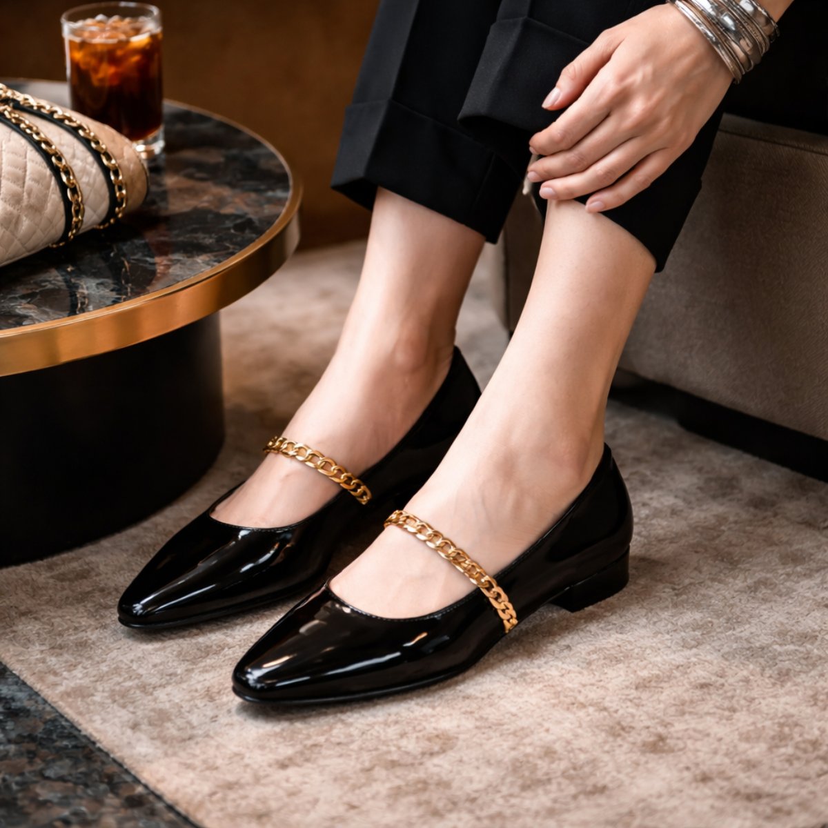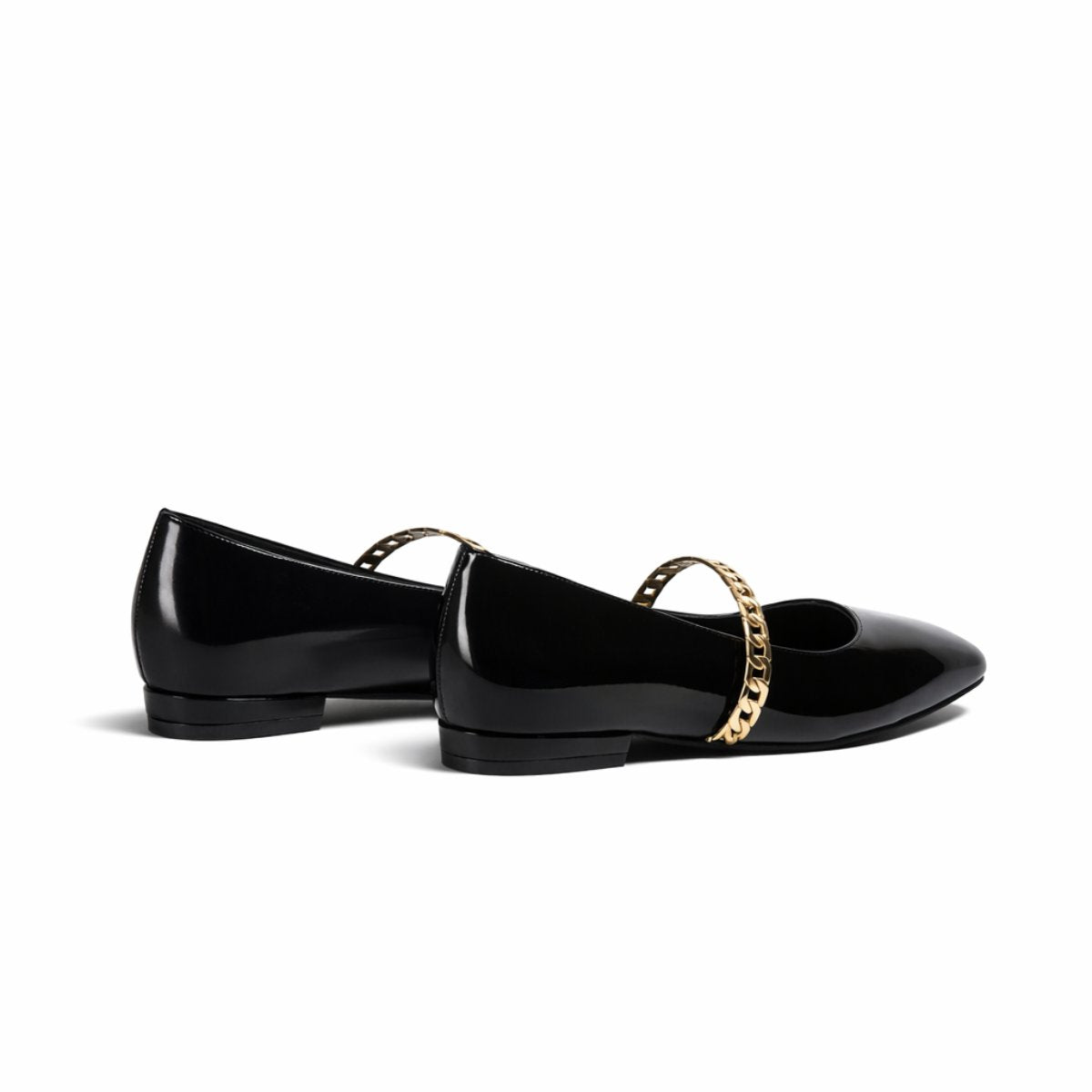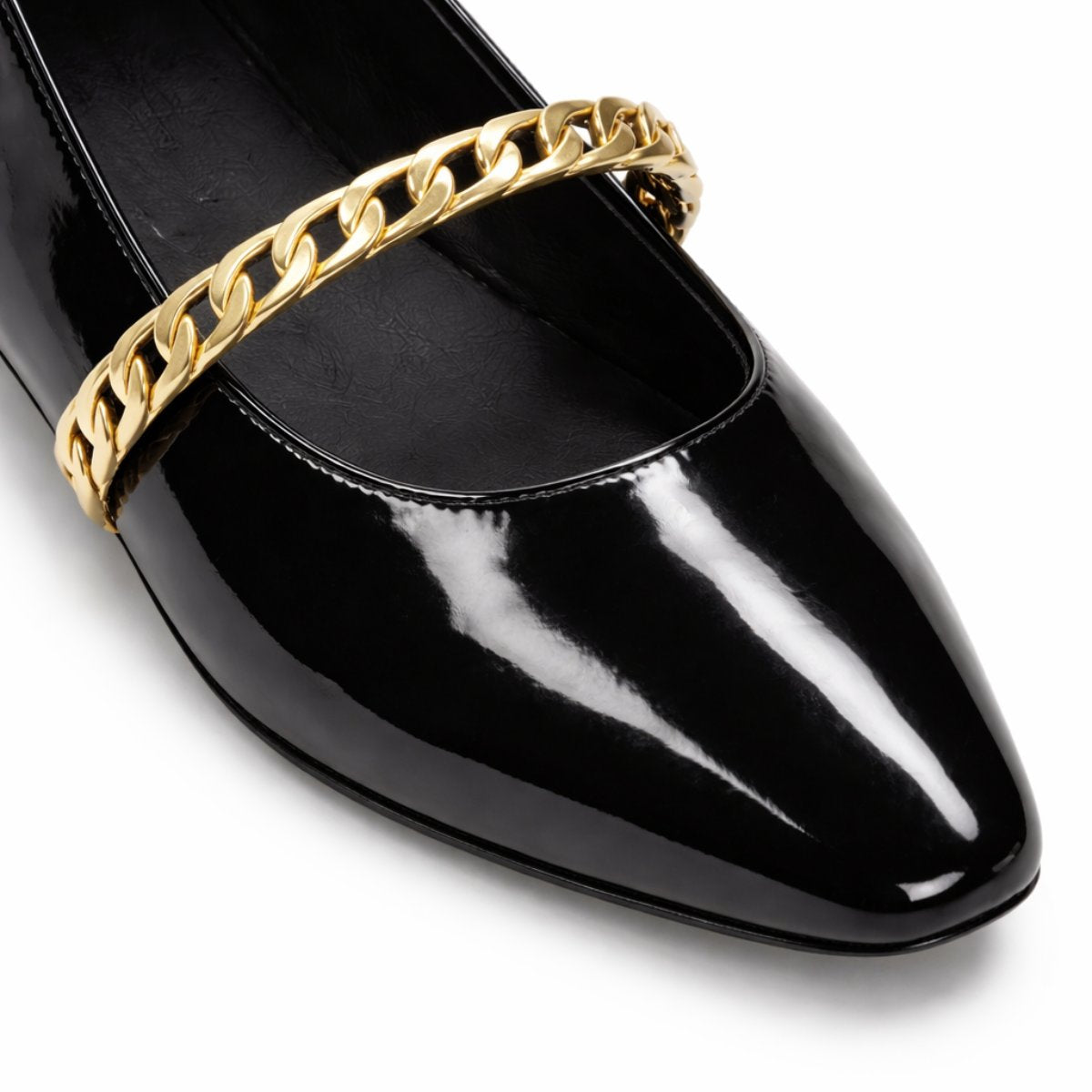 Flat en negro charol con diseño sofisticado y versátil, ideal para looks ejecutivos o urbanos pulidos. Su cadena metálica aporta carácter sin exagerar. Cuenta con forro y plantilla de piel que brindan comodidad natural y sensación ligera en cada paso. Altura de 1.5 cm que ofrece estabilidad y practicidad diaria. Suela TR resistente y flexible para mayor durabilidad