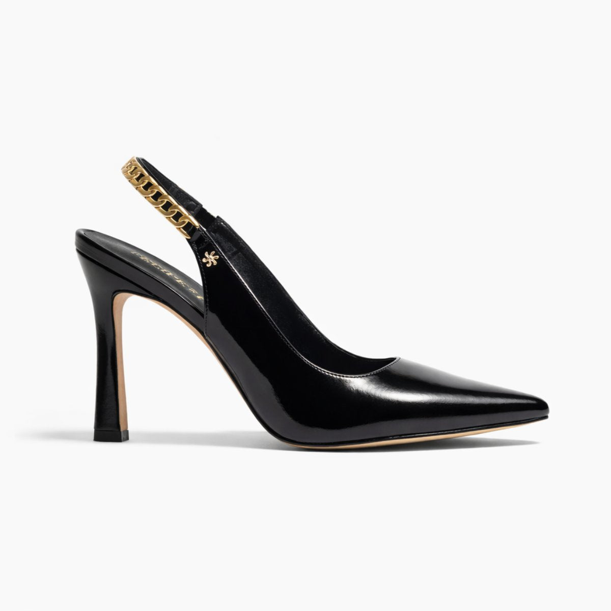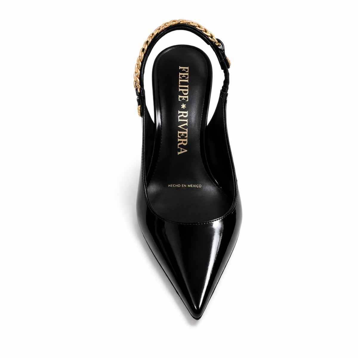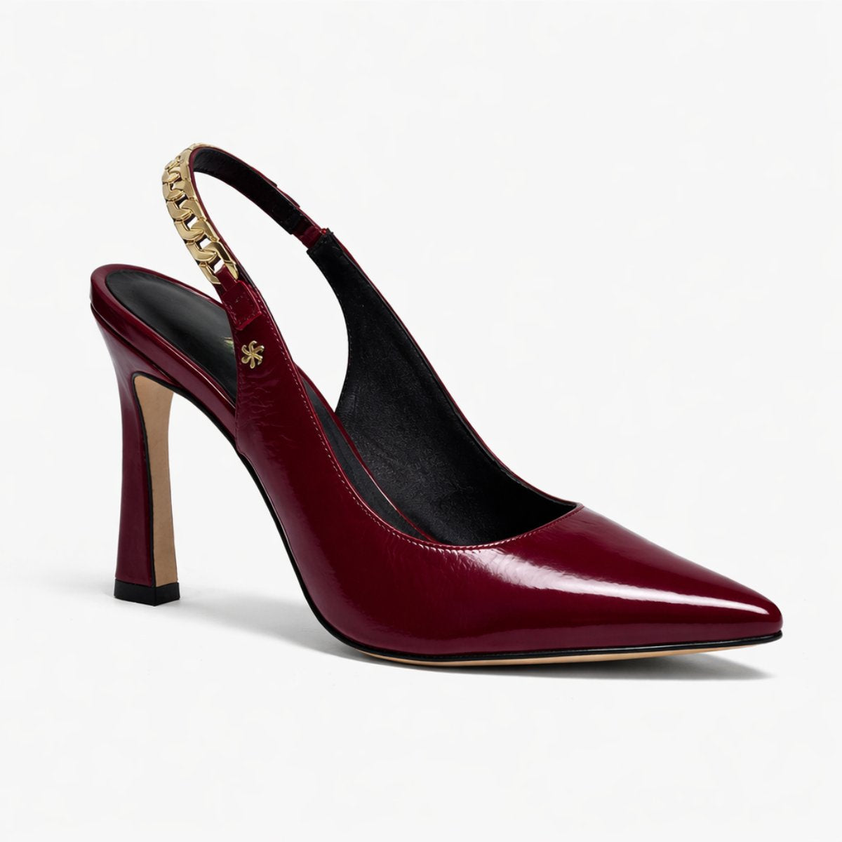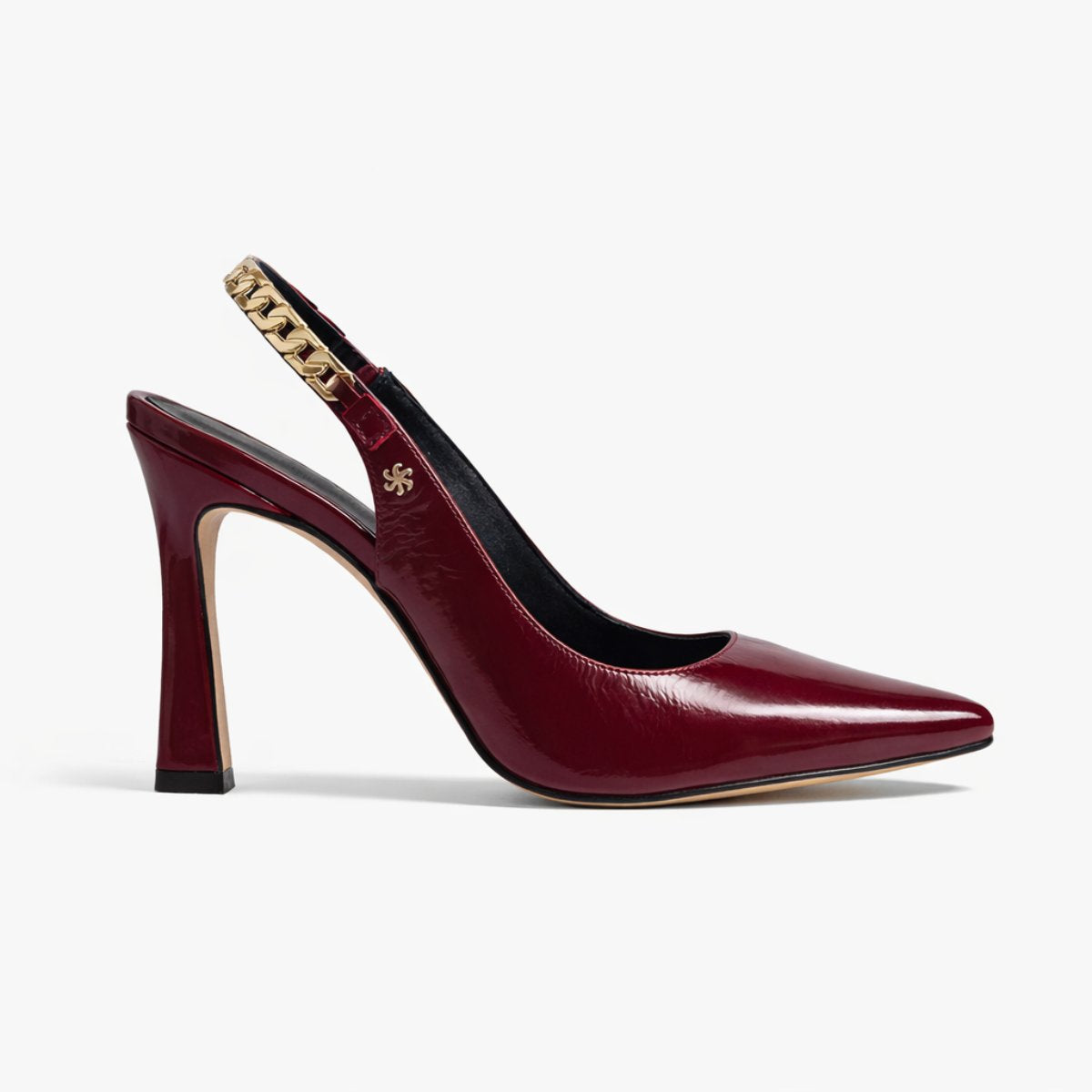 Zapatilla destalonada de 9.5 cm elaborada en piel brillosa tipo charol que estiliza y aporta presencia sofisticada. Su diseño en punta alarga visualmente la pierna, mientras la pulsera trasera con detalle metálico dorado agrega un toque distintivo y elegante. Forro y plantilla de piel para mayor confort y transpirabilidad. Suela española de caucho antideslizante de alta resistencia que brinda seguridad y estabilidad al caminar.