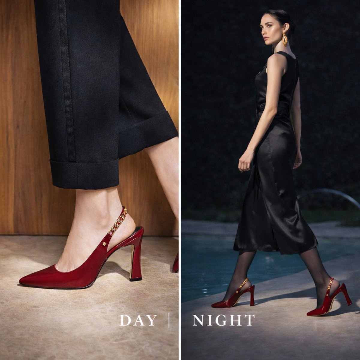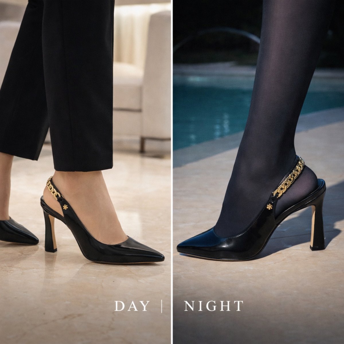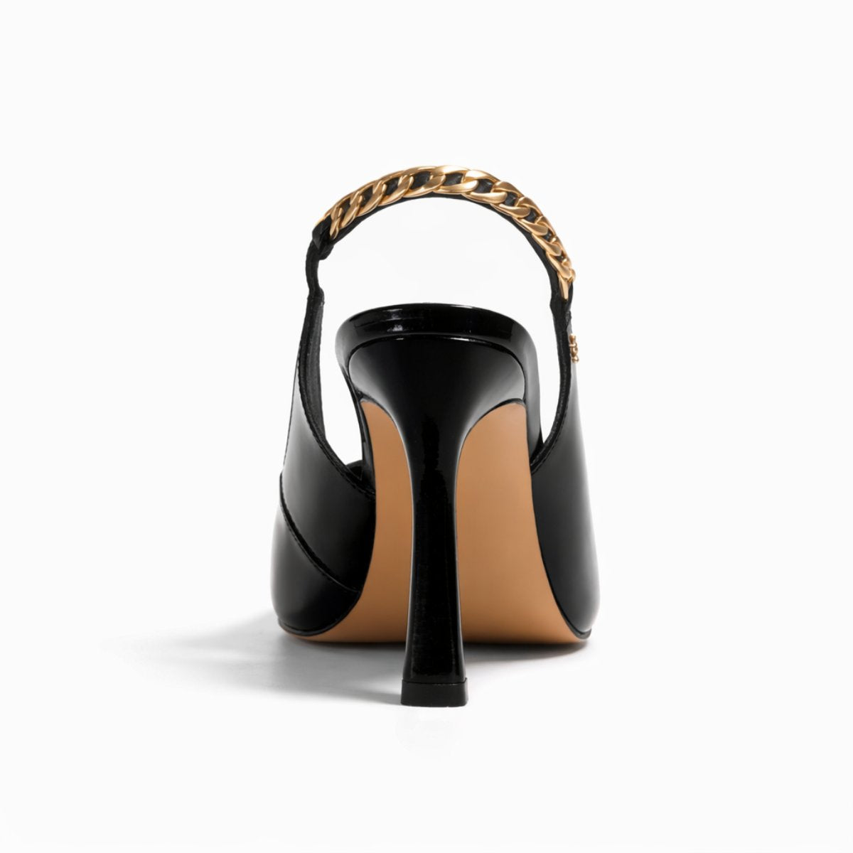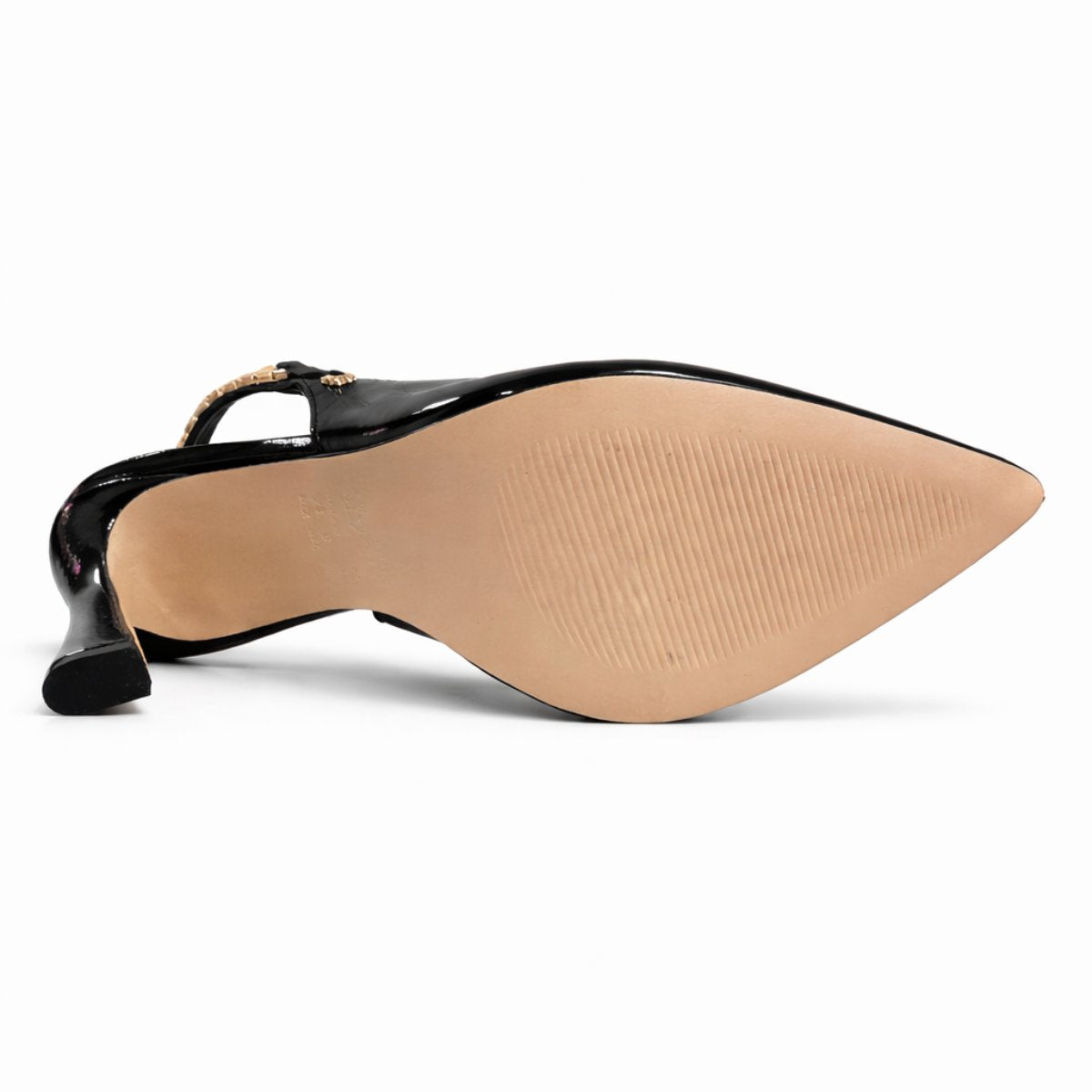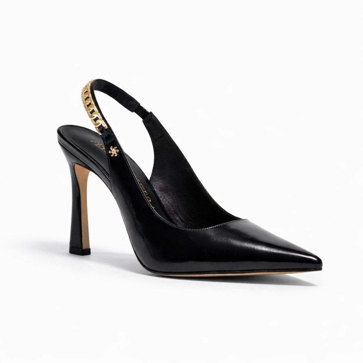 Zapatilla destalonada de 9.5 cm elaborada en piel brillosa tipo charol que estiliza y aporta presencia sofisticada. Su diseño en punta alarga visualmente la pierna, mientras la pulsera trasera con detalle metálico dorado agrega un toque distintivo y elegante. Forro y plantilla de piel para mayor confort y transpirabilidad. Suela española de caucho antideslizante de alta resistencia que brinda seguridad y estabilidad al caminar.