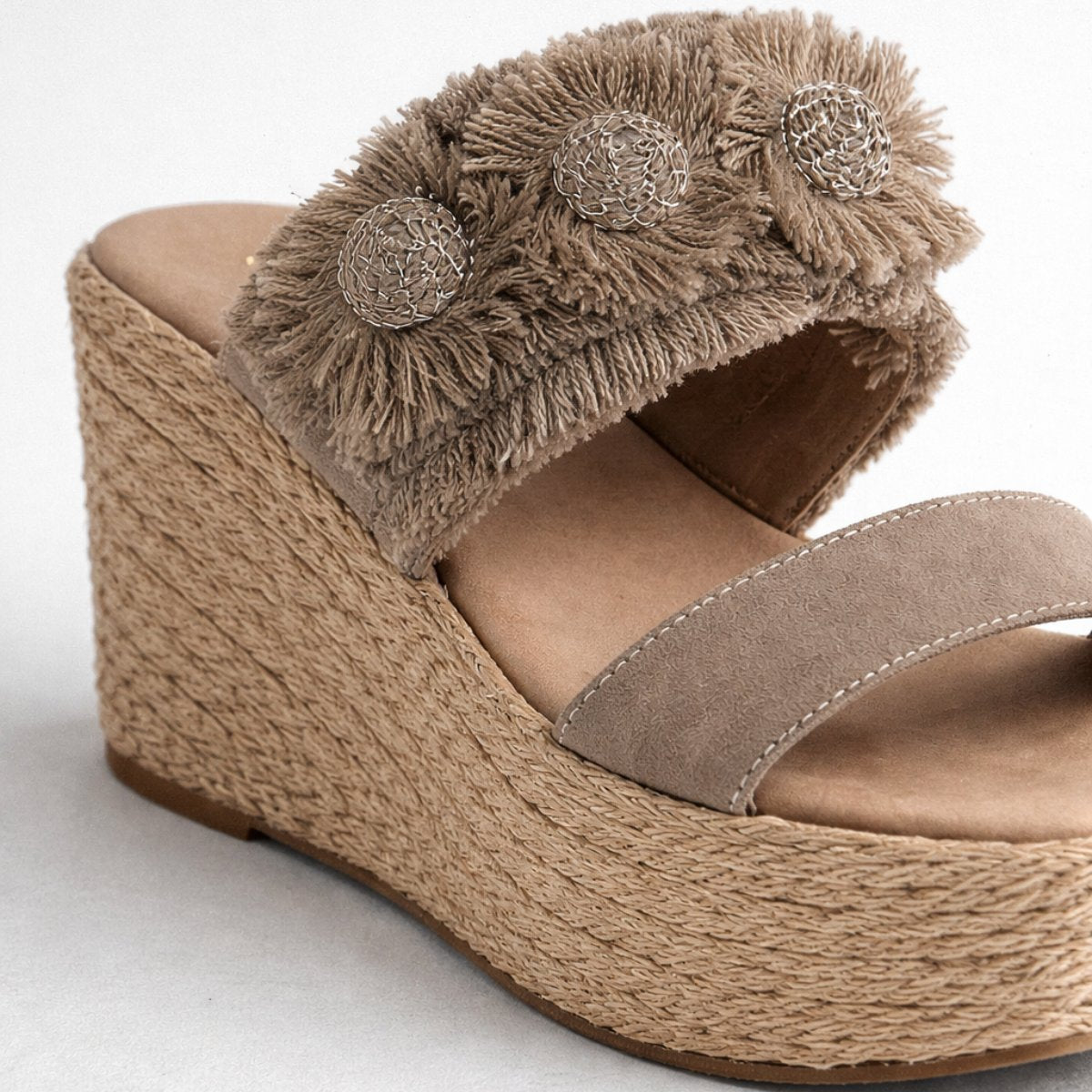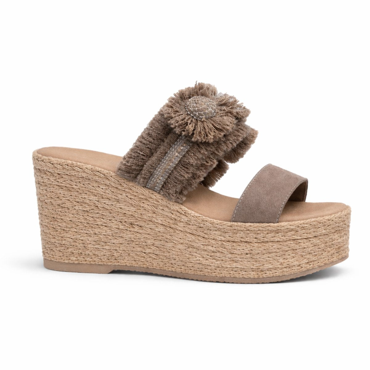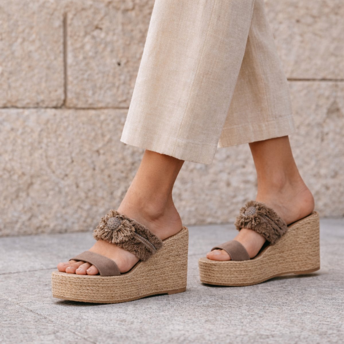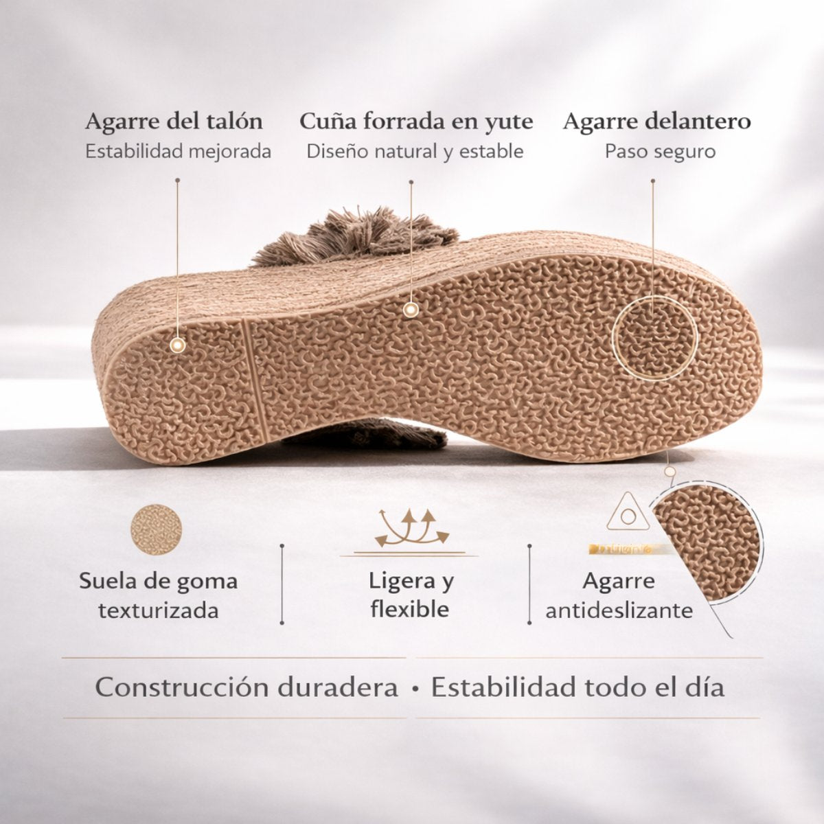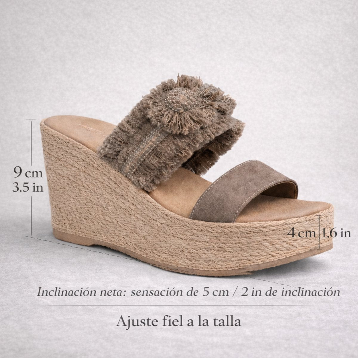 Alpargata de plataforma con tacón de 9 cm y plataforma frontal de 4 cm que reduce la inclinación real para mayor comodidad. Su cuña continua brinda estabilidad al caminar, mientras el detalle textil con flor aporta un diseño distintivo que eleva cualquier outfit. Ligera, versátil y de ajuste fiel a la talla, ideal para usar todo el día con seguridad y estilo.