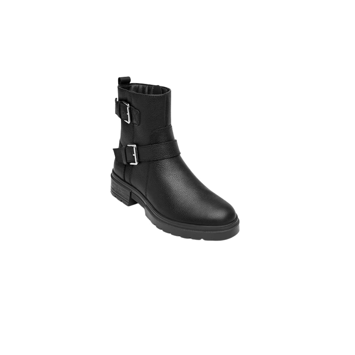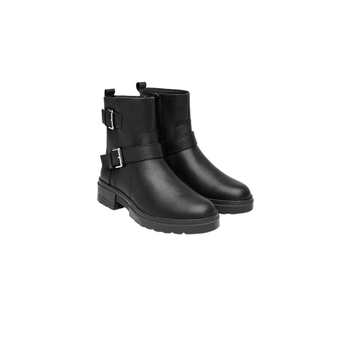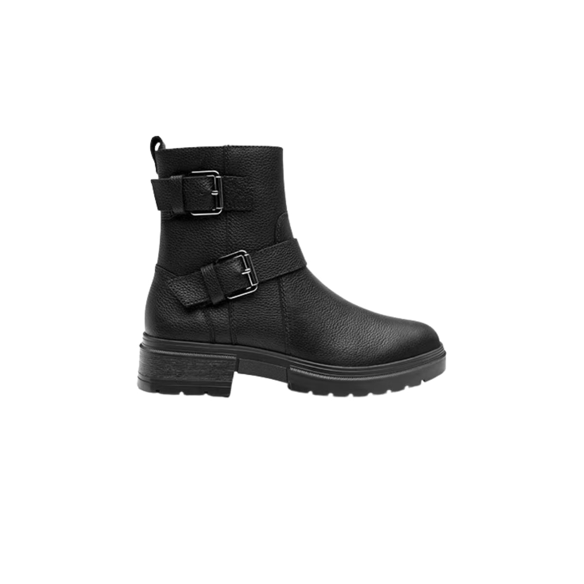 - Botín biker de piel negra, moderno y versátil para uso diario.
