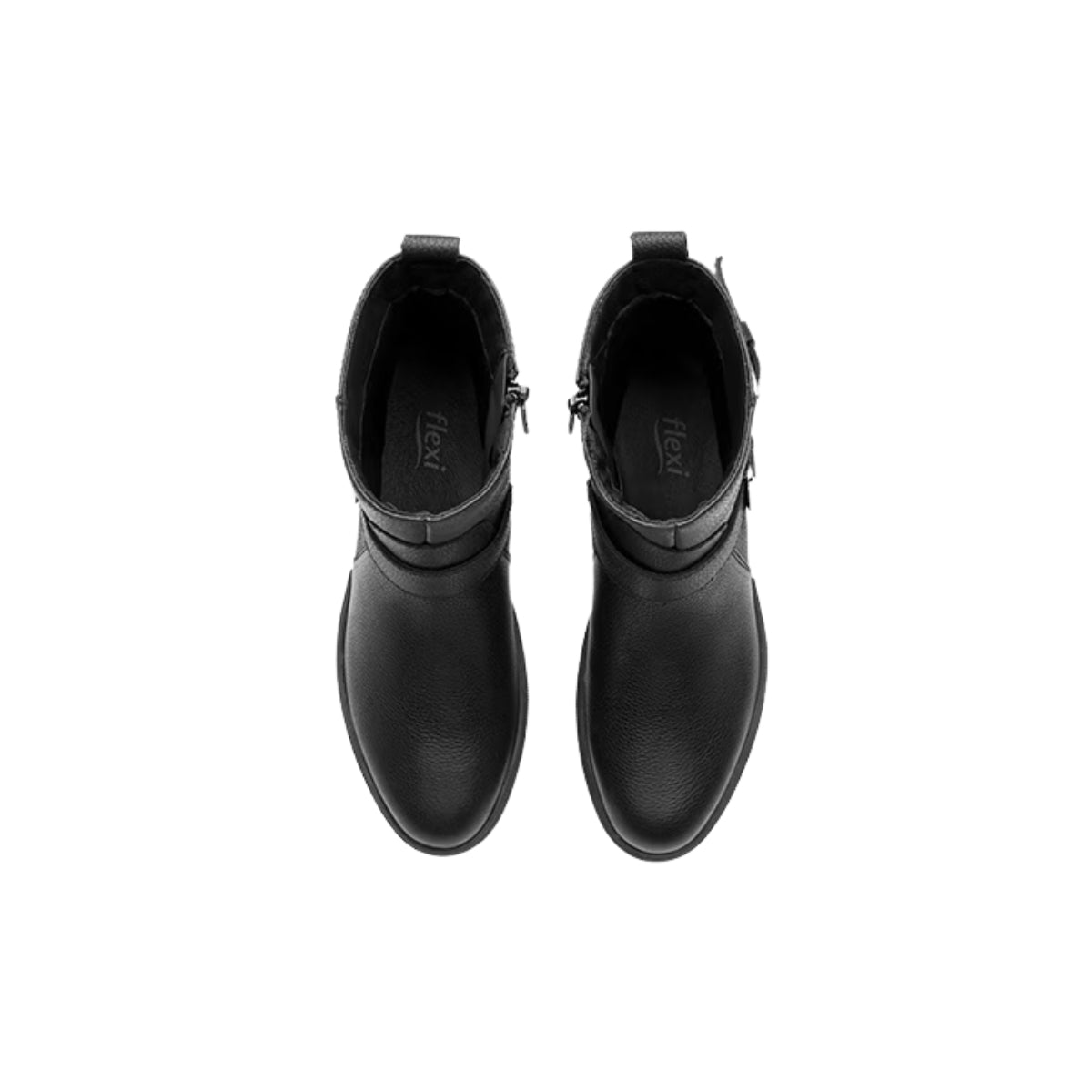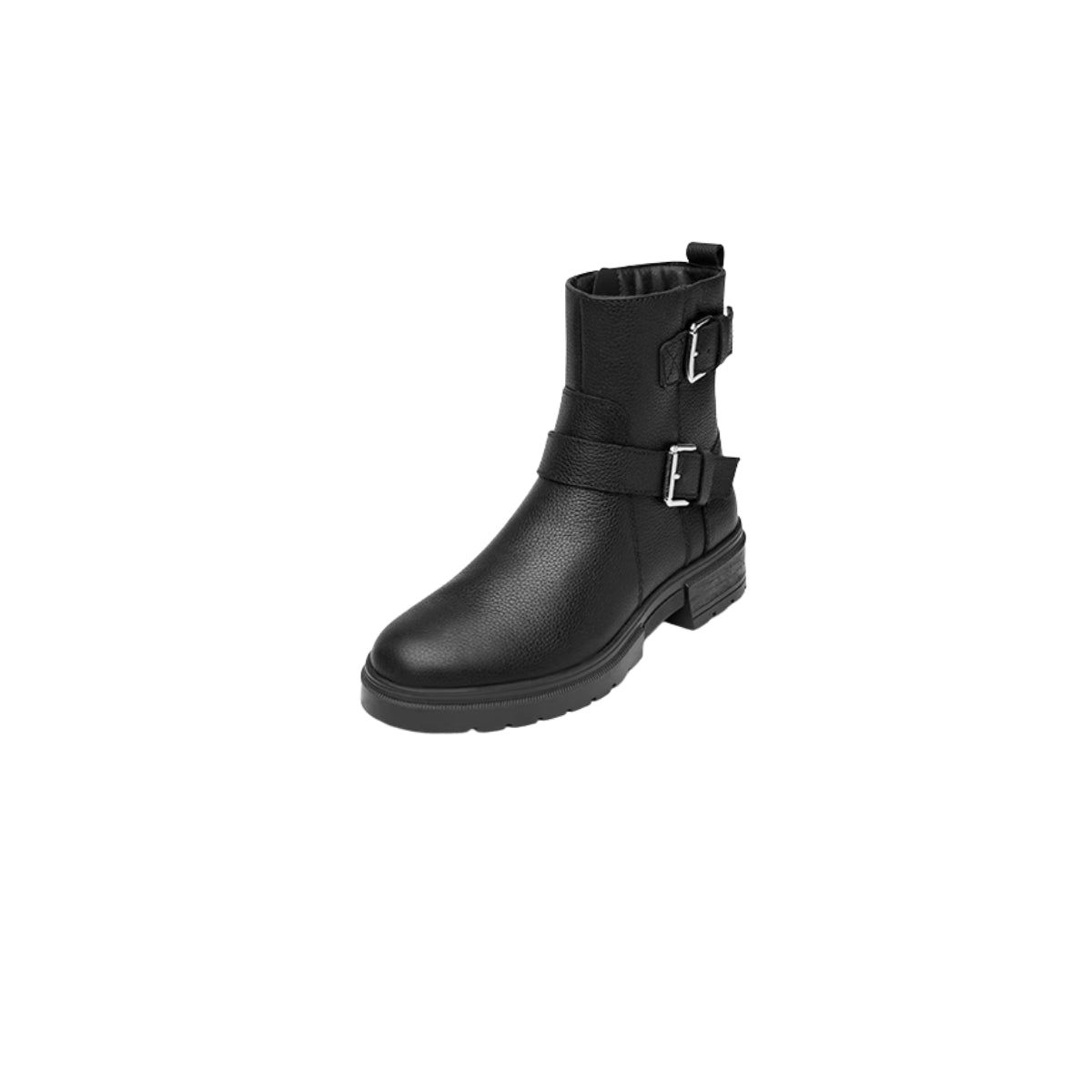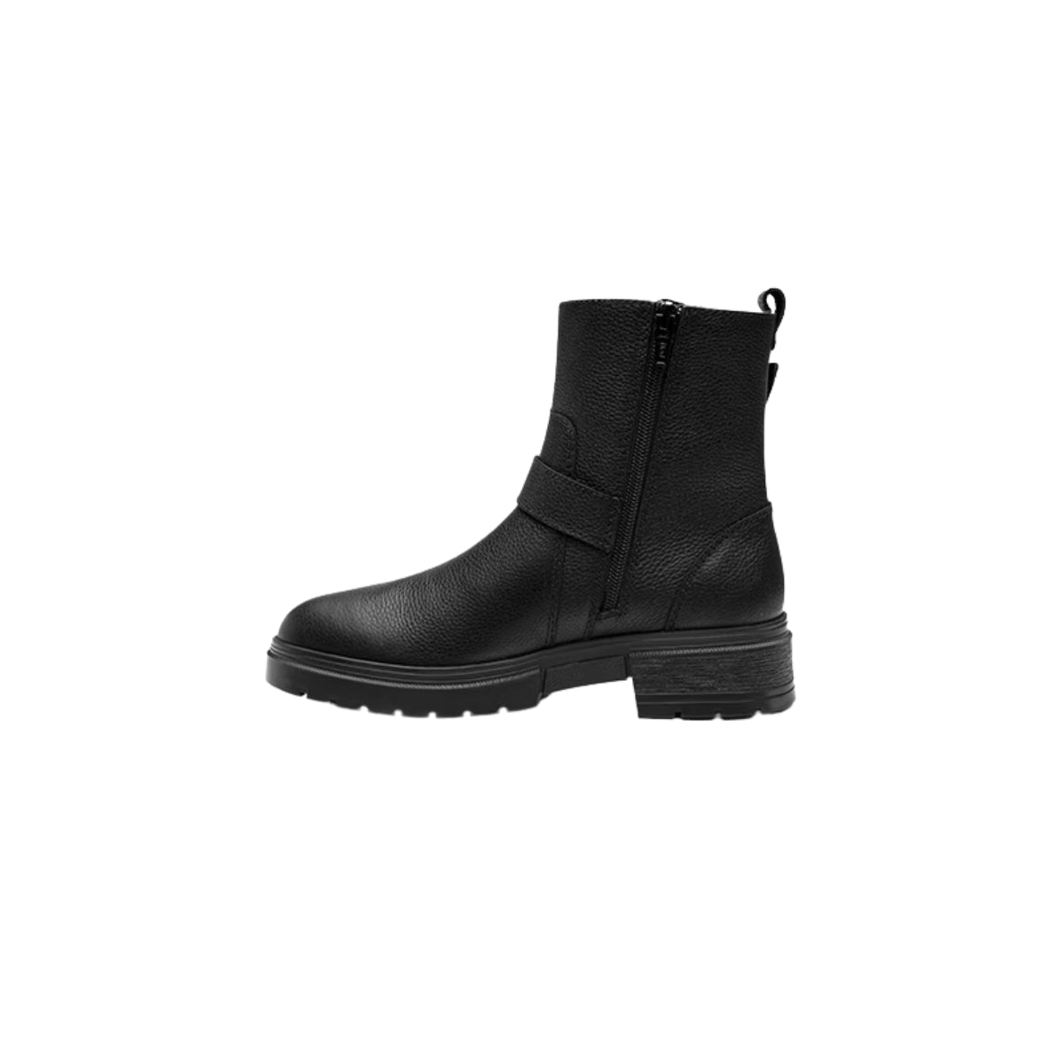 - Botín biker de piel negra, moderno y versátil para uso diario.